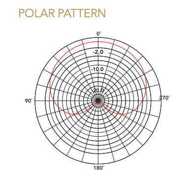 Mikrofonen har ett Cardioid Polar Pattern där känsligheten för inkommande ljud framför allt är framifrån. Den är inte helt blind på baksidan men nästan.