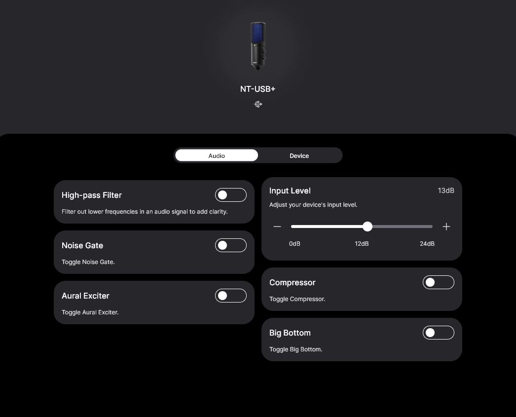 Klickar du på NT-USB+ kanalen uppenbarar sig APHEX där du med flera funktioner kan förbättra ljudet. Ett High-Pass filter kan hjälpa med sus och fläktar i lokalen, Noise Gate klipper allt ljud under en viss tröskel, Compressor klipper av på toppen och lägger till på botten så att volymen blir jämt, Aural Exciter hjälper till att ta fram tydlighet och klarhet i ljudet och slutligen Big Bottom, som ökar de djupare frekvenserna så att din röst rör dig åt en mullrande trailer-röst.