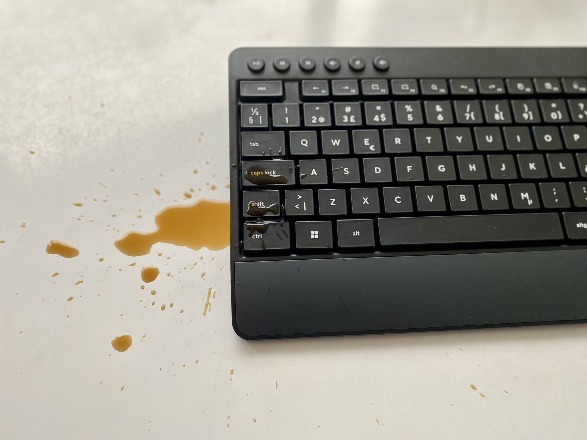 Hur var det då med skydd mot spill? Jodå, vi hällde ut kaffe på tangentbordet (endast detta som har spill-skydd, musen har det inte), lät det droppa av, torkade bort fukten och allt fungerade fint sen ändå. Jämför man med Apple-tillbehör som kostar skjortan och avlider direkt vid minsta fuktkontakt så är detta en helt annan ambitions-nivå. Det finns till och med små hål för avrinning inbyggda i botten av tangentbordet. Smart och billig försäkring, då man inte ska ha vätskor nära datorn, men oj vad vi ändå gillar att ha det på kontoret (och vi tror inte vi är ensamma). Däremot skulle vi inte behandla tangentbordet som vattentätt, så viss försiktighet är ändå påkallad.
