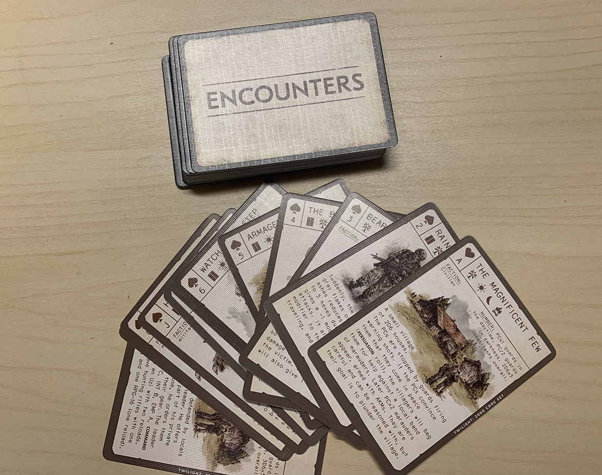 När jag öppnar lådan så blir jag direkt lyrisk över två saker. För det första så känns det som om det aldrig tar slut på prylar. Här i finns 52 stycken möteskort (Mer om det längre ned), tio stycken initiativkort, 16 stycken mindre stridskartor och en enorm dubbelsidig stridskarta. Det finns även 108 kartongmarkörer, 15 specialtärningar och 5 stycken tomma karaktärsark.