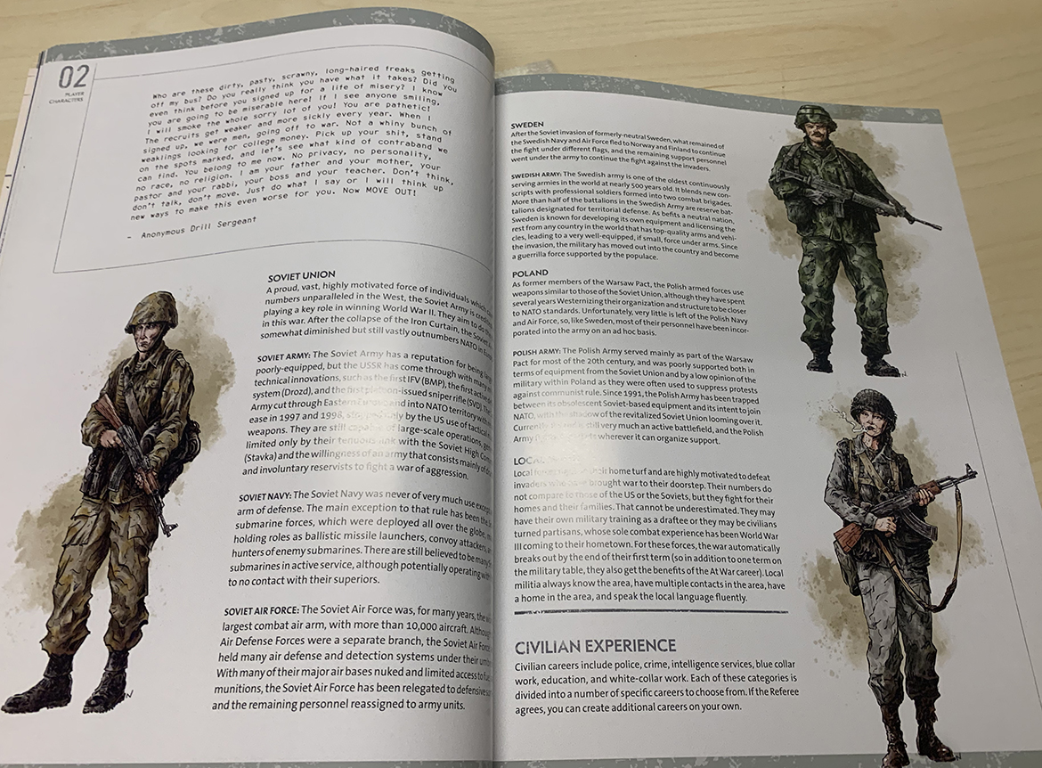 I spelet finns detaljerade beskrivningar som gör att du kan starta som Amerikansk, Svensk, Polsk eller rysk soldat och spelområdena som finns beskrivna är Sverige och Polen. Fast med ganska små medel kan du alltid anpassa din spel session till att utspela sig var som helst i Europa utan några större problem. Det finns som vanligt en uppsjö av olika karaktärer att välja mellan. Du kan starta som civilist som hamnat mitt i krigets fasor eller så kan du vara olika sorters soldater. Du kan även välja att börja spelet som en ganska ung karaktär som följt med en äldre släkting in i kriget.