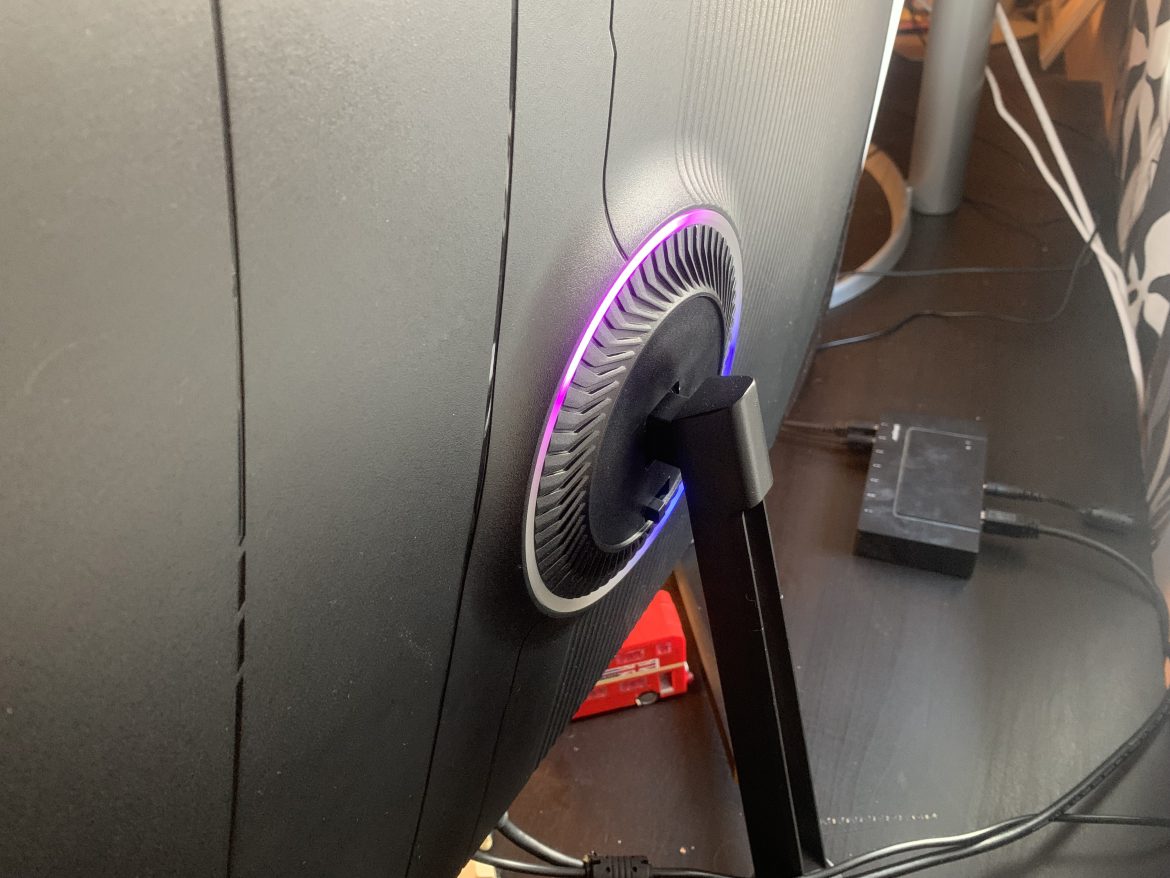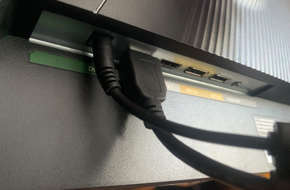 När jag har kopplat in strömmen och anslutit datorn via HDMI finns det fyra ingångar på baksidan: två HDMI 2.1 och två DisplayPort v1.4. Dessa sitter infällda och en bit upp, så det är inga problem att dölja sladdarna i en fin samling ned på baksidan. Här finns även möjlighet att koppla in ljud, om du vill.