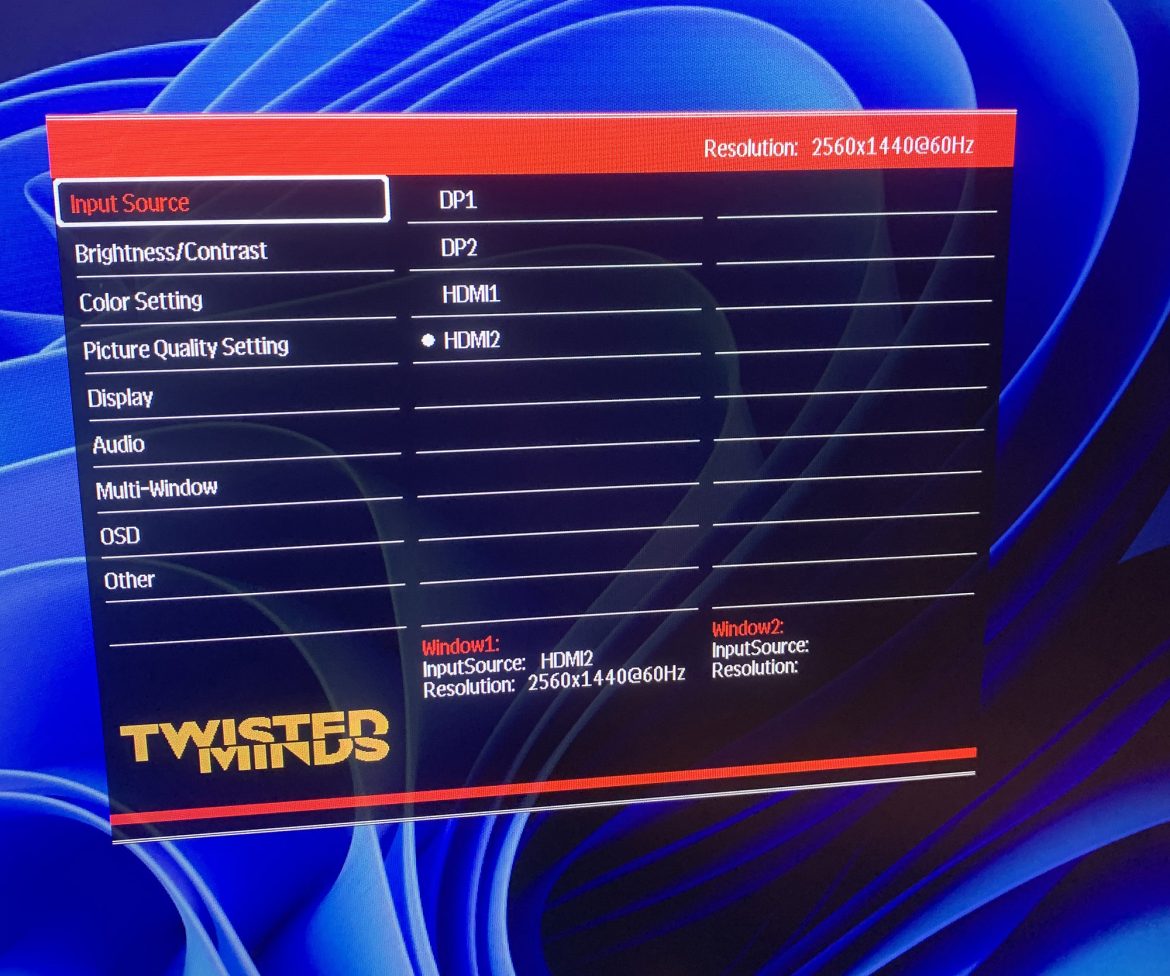 När allt är inkopplat är det dags att starta upp datorn. Jag kopplar in TM32QHD165VA som min sekundära skärm (mer om varför jag gör det kommer längre ned). Direkt stör det mig att det inte går att göra några fysiska justeringar på skärmen, och därmed kan jag inte ställa in den fysiskt exakt så som jag hade velat. Jag hittar ett mellanting som jag nöjer mig med. Skärmen upplevs först väldigt grådassig i jämförelse med min primära skärm (LG, 27tum, 4K, 60hz), och jag får återigen en känsla av att Twisted Minds-skärmen kanske inte håller måttet? Men den känslan går snabbt över när jag går in i menyerna och kan skräddarsy bilden så att den passar mig och att den matchar inställningarna på min primära skärm. Så varför vill jag inte ha TM32QHD165VA som min primära skärm, om nu bilden är bra?