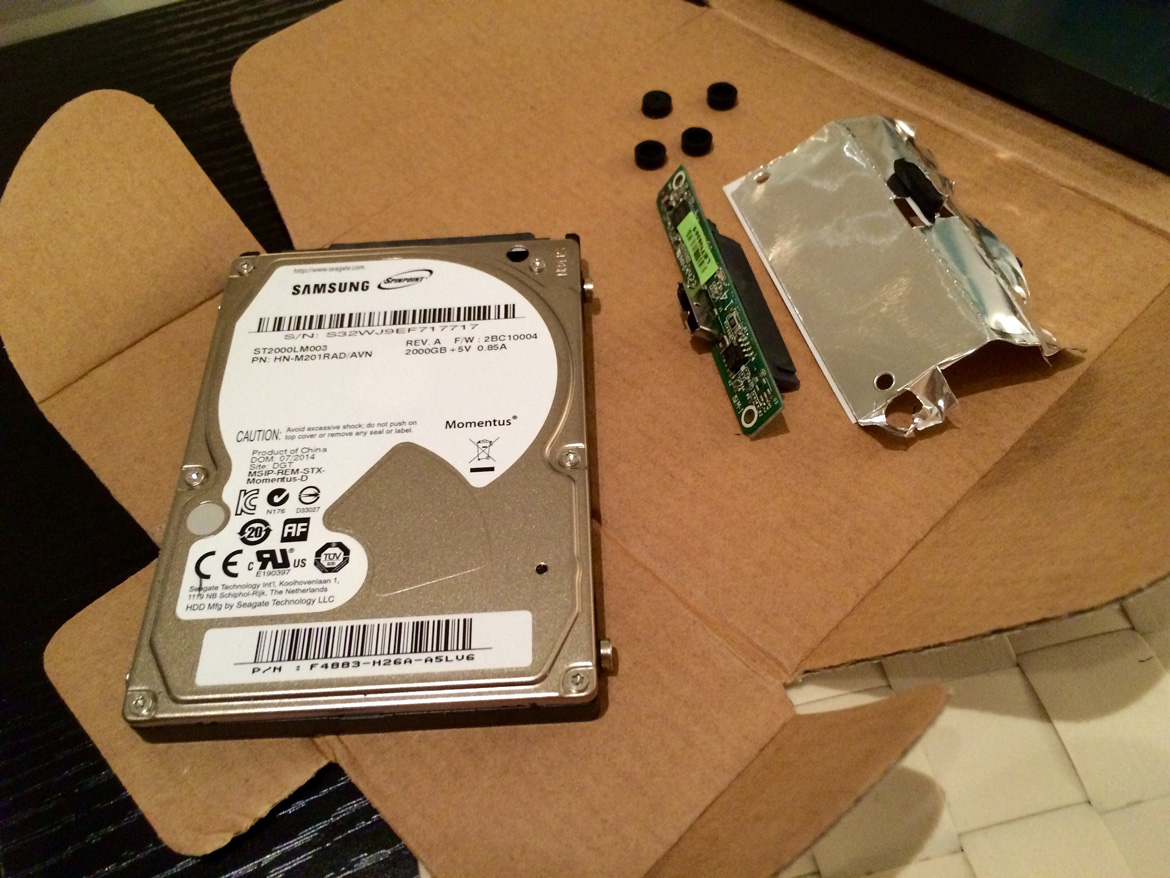 Det finns många bra 2 TB:are därute och de ligger alla runt tusenlappen i skrivande stund. Vårt val föll på Seagate/Samsung STBX2000401, ett märke vi haft goda erfarenheter av tidigare, som har USB 3.0-stöd för snabbast överföring. En slagning på Prisjakt ger dig dagspris, men vi fick den för 949:- med frakt på CDON och det får ses som ytterst prisvärt. Vilken 2,5″-disk som helst som är max 9,5 mm tjock passar dock, så känn dig fri att välja det märke som du har bäst erfarenhet av. Du som har gott om slantar kan fundera på en SSD-disk eller någon slags kombo-dito, men var medveten om att mätningar visar att prestandaökningen i praktiken är ytterst marginell, och kommer till ett betydligt högre pris än standard 5400/7200 RPM-diskar, särskilt om du går upp på 1 TB eller mer (på kombon, inte SSD – de är betydligt rappare).