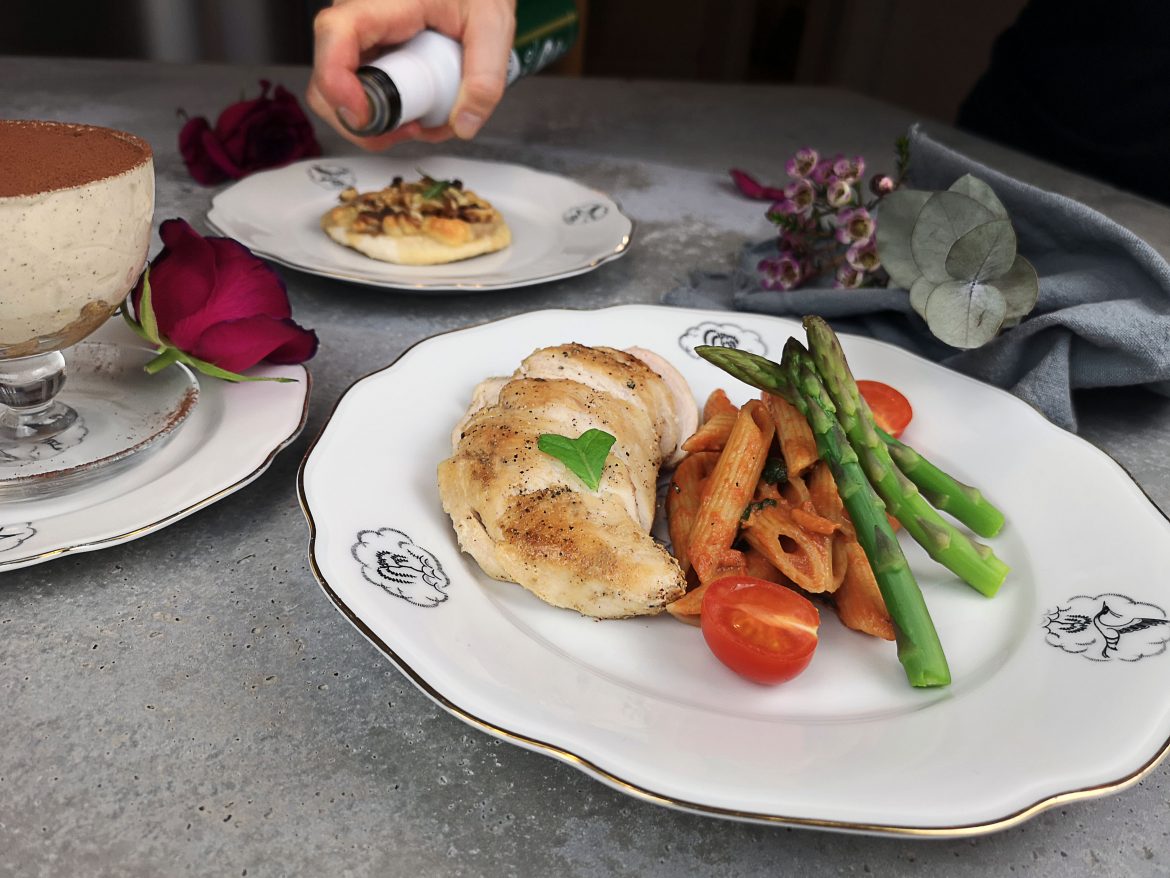 Nu när pippin stekt fint på båda sidor så kör vi färdig dem i ugnen. Det är inte ett måste, men det gör det enklare att veta att kycklingen är genomstekt och det är viktigt med just kyckling. Vi vill att dom ska hålla en innertemperatur på 72 grader celsius. Här underlättar det med en stektermometer. Annars är 20 minuter en bra tid att gå efter. Ta ut kycklingen, ta bort rosmarin och vitlök och skär upp köttet som du önskar servera det, lägg upp pastan bredvid och ringla över olivolja och dra några varv med svartpepparkvarnen. Koka sparris i lätt saltat vatten, låt dom koka i tre minuter och skölj sedan av i kallt vatten. Då behåller sparrisen sin fina gröna färg. Garnera sedan med sparrisen och körsbärstomater.