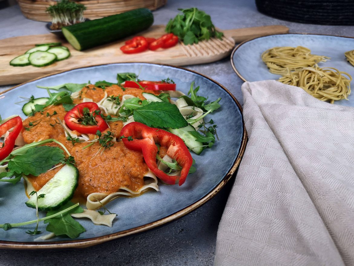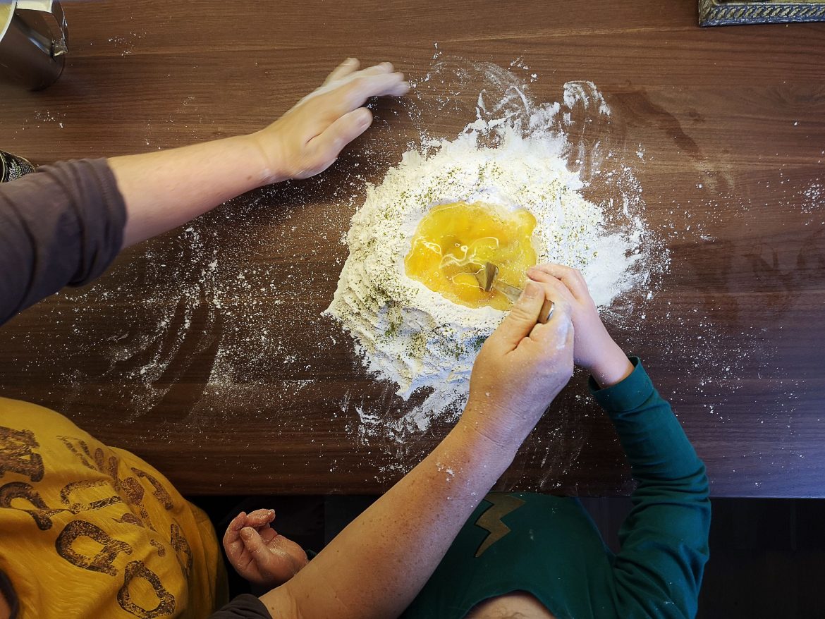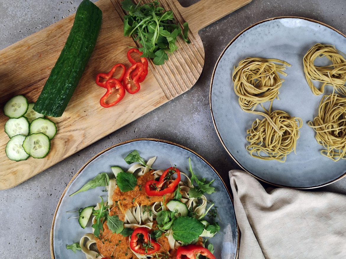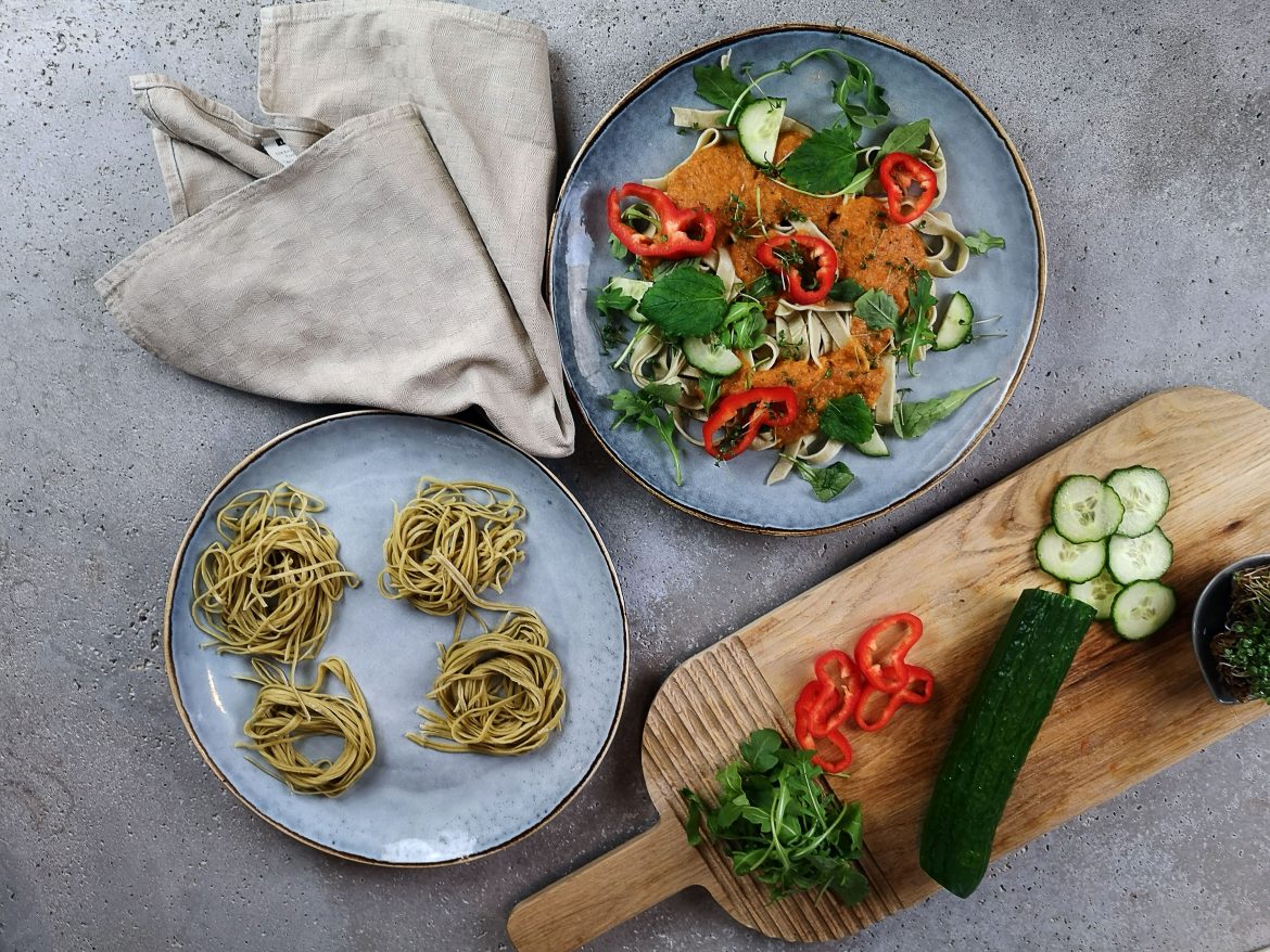 Jo, vi gör en redig tomatsås från grunden och knådar egen pasta. Pastadegen gör vi inte på traditionellt vis, utan på vårt eget sätt. Vi har i lite matcha (som är ett te) för att få en härlig grön nyans, smak och många nyttigheter.