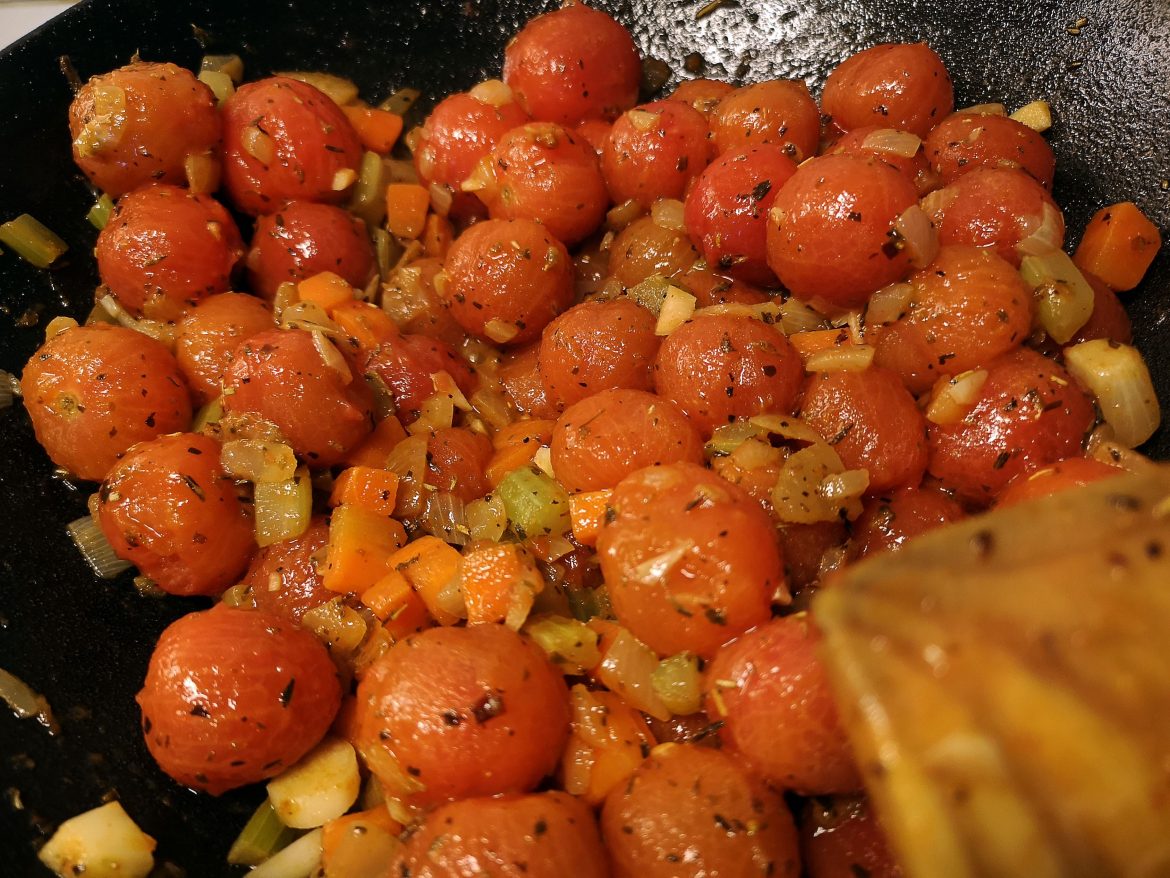 Vi börjar tomatsåsen och med den klassiska basen ”moire poix”, eller treenigheten, som den kallas på svenska. Det är en grund till många såser och grytor. Den italienska motsvarigheten heter soffritto, och kanske är det ordet jag ska använda när det är en sås till pasta vi gör. Å andra sidan är jag upplärd med köksfranska och de flesta kökstermer jag kan, och använder, är franska eller har franskt ursprung.