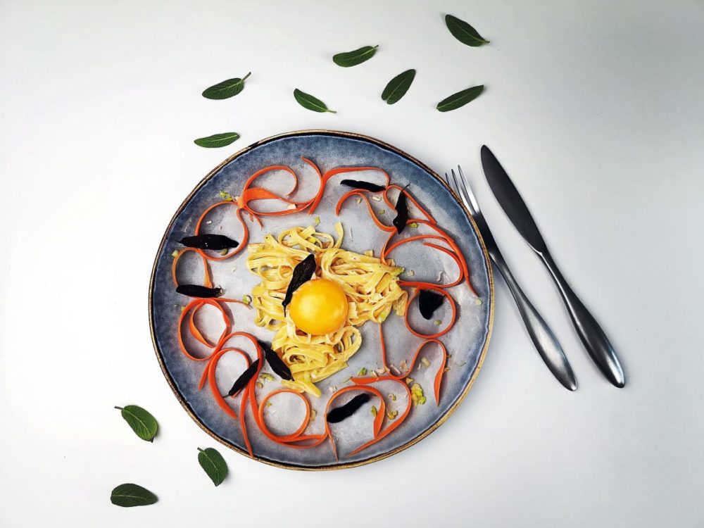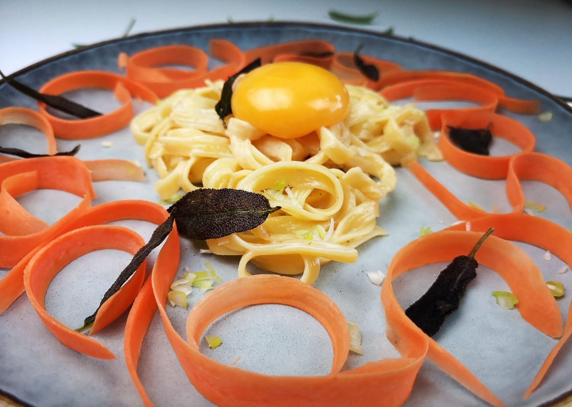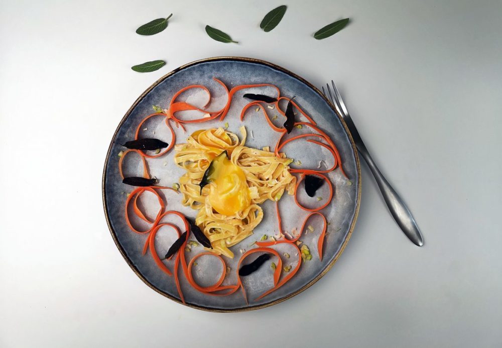 Lägg upp pastan på tallrik, lägg morötterna vid sidan om och toppa med äggula, friterad salvia och lite hackad färsk salvia.