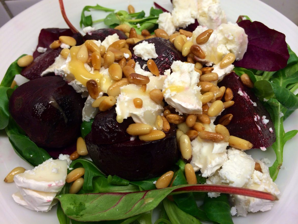 Servera betorna på en bädd av ruccolasallad, smula ned önskad mängd chèvre, dekorera med de rostade pinjenötterna och strila över lite honung!