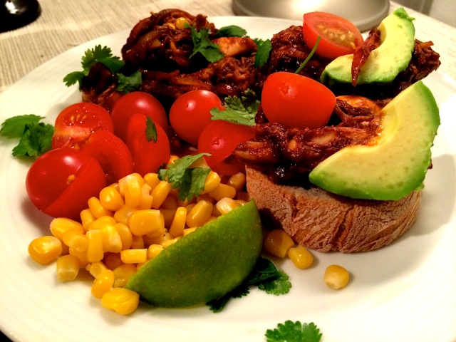 Servera röran på färskt bröd och dekorera med skivad avokado, körsbärstomater och lättrostad majs (görs enkelt i en stekpanna).