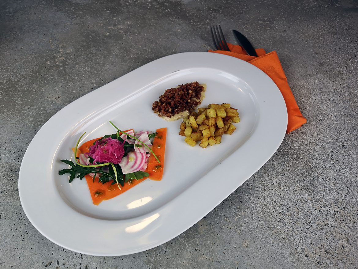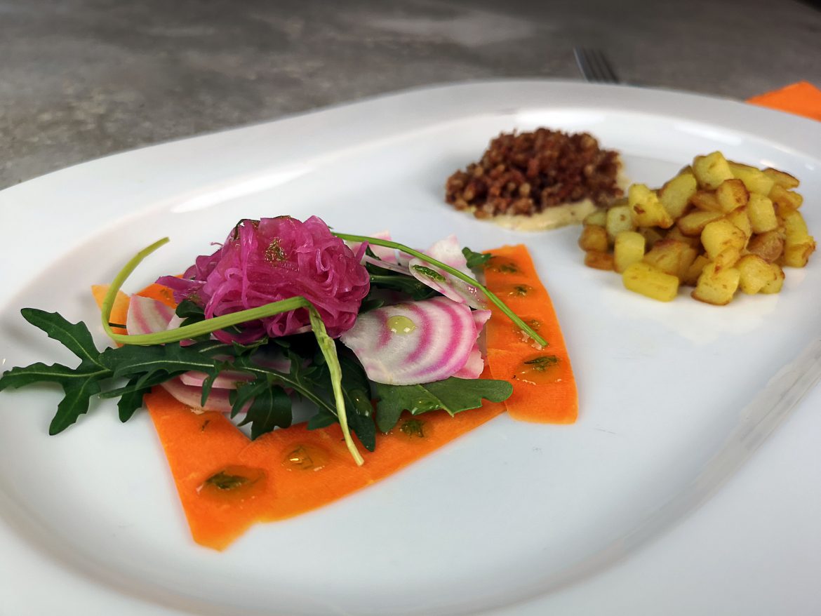 Innan servering, skär upp polkabeta på mandolin eller med potatisskalare. Strimla moroten med potatisskalare i fina strimlor. Varva rucola, babyspenat, polkabeta och morot. Toppa med den picklade rödlöken och örtoljan. Lägg senapscrème på tallriken och bred ut med sked, lägg isterbandssmulet ovanpå. Lägg upp den stekta potatisen bredvid och njut av isterband revisited.