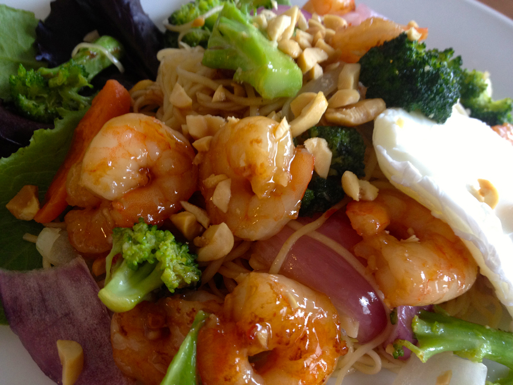 Stek räkorna tillsammans med marinaden så att de får fin färg på båda sidor. Blanda med nudlar och grönsaker.