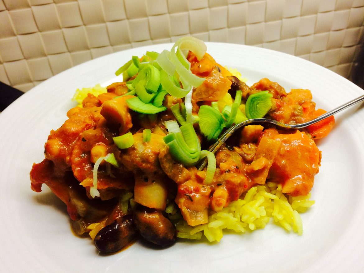 Under tiden som riset kokar: Hacka upp en stor, gul lök, 4 vitlöksklyftor, färska champinjoner (ca 8 st) en röd paprika, en bit vitkål, en stor morot (skär i halvmånar) och en halv purjolök och stek dem i en gryta med lite olivolja. Skala en liten bit ingefära och riv ned i grytan. Salta, peppra och krydda med allroundkrydda, chilipeppar, Cayenne och persilja. Pressa ut lite tomatpuré och rör om så att allt blandar sig.
