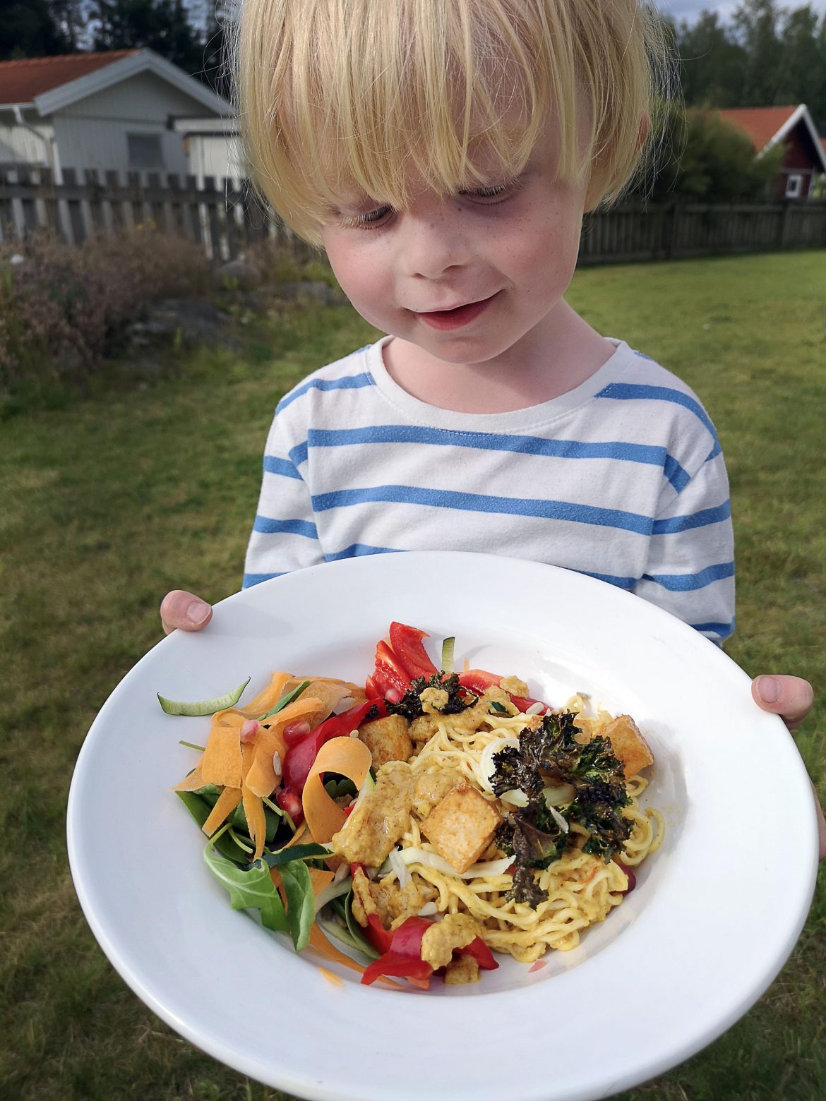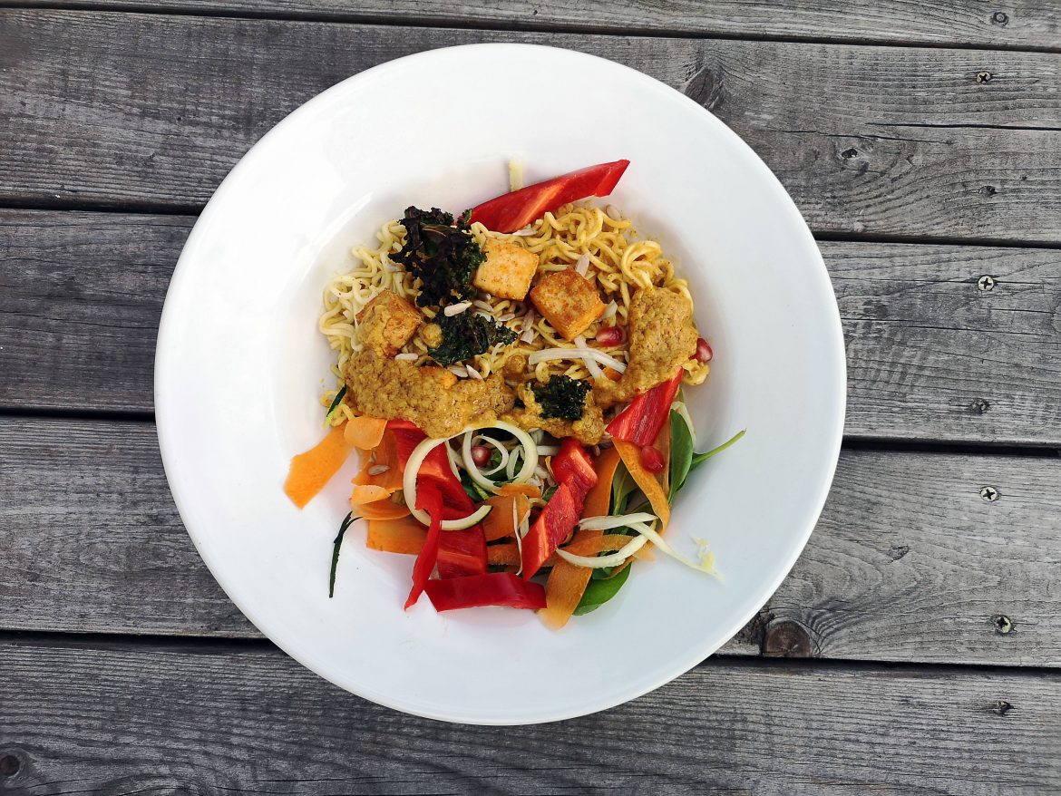 Vänd runt de färdigkokta nudlarna i jordnötssåsen så det blir klibbiga och goda, servera med tofukuberna, strö över den ugnsrostade grönkålen och varför inte någon härlig sallad?