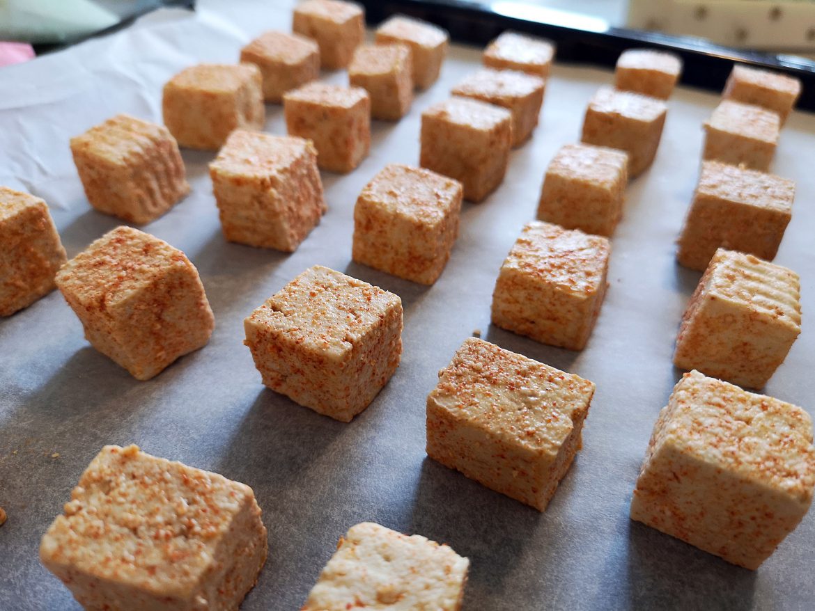 Skiva upp tofun i bitar, en kub på ungefär en centimeter. Doppa sedan alla tofukuberna i kryddmassan du just rörde ihop och lägg dom på en bakplåtspappersklädd plåt. Sätt in i ugnen i cirka 30 minuter.