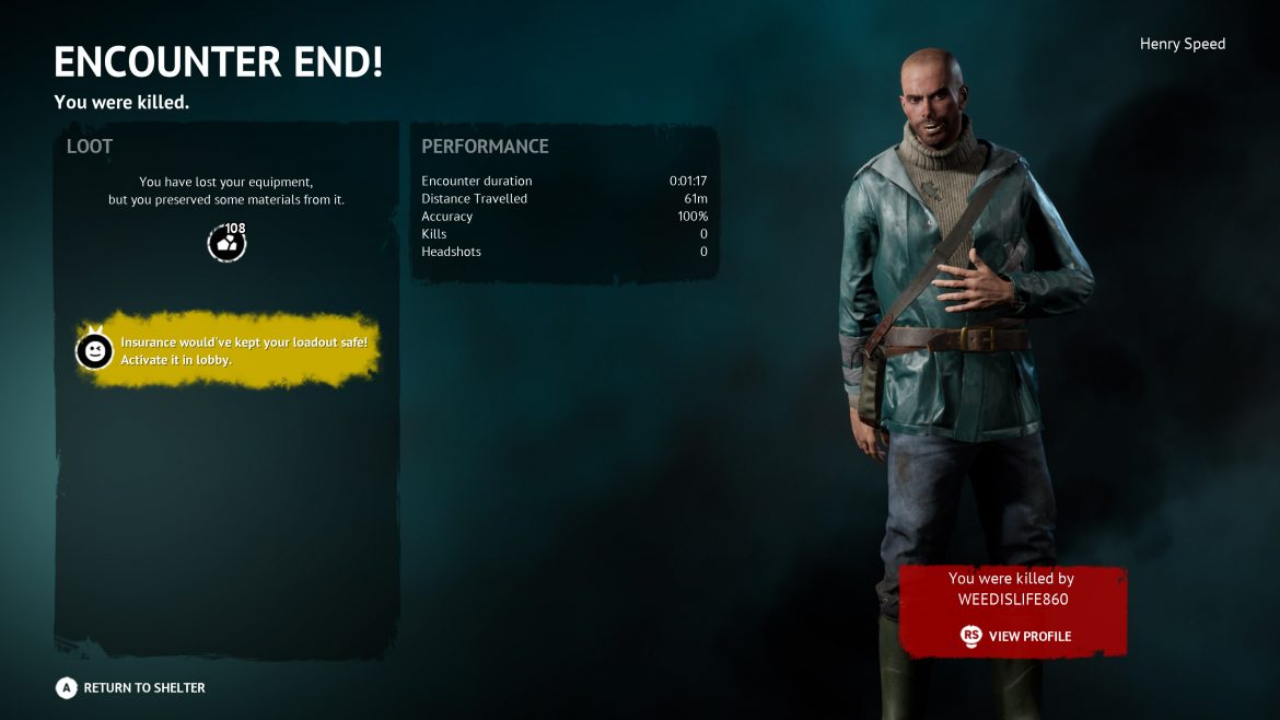 Det blir tyvärr snabbt lite tjatigt och har du kassa vapen eller inte tränat tillräckligt så dör du innan du ens hinner att se vem som skjuter på dig. Har du inte skaffat dig försäkring då så blir du av med ALLT som du bär på dig och får börja om från början igen. Vilket är rätt tröttsamt; för har du inga grejer hemma så får du ge dig obeväpnad ut och leta i lådor..