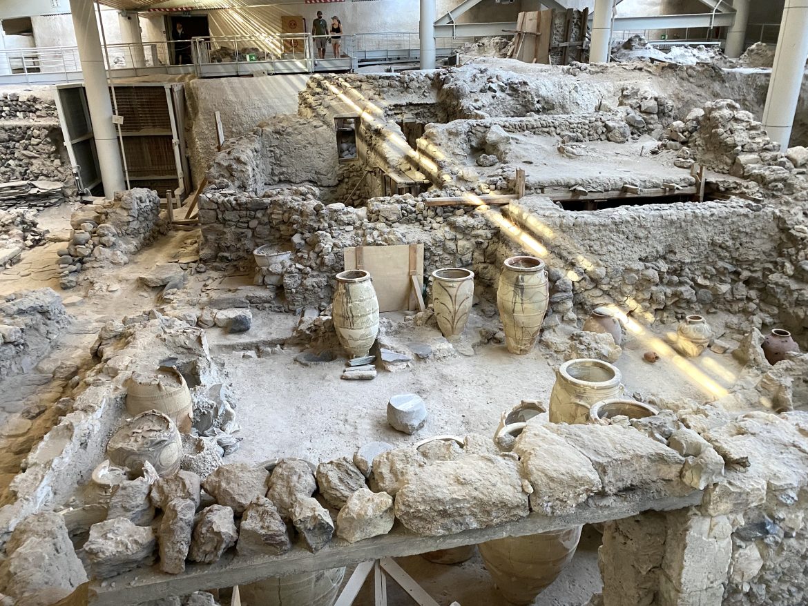 Efter ett par välfyllda dagar i Italien gick resan vidare till den grekiska ön Santorini (som många felaktigt tror är italiensk på grund av namnet). Denna ö ligger norr om Kreta, ganska mitt i medelhavet och liknar idag formen av en halvmåne. Ön är en före detta aktiv vulkan och för drygt 60 år sedan började man gräva ut en antik stad man givit namnet Akrotiri (”grottan”). Denna stad – som kan ha grundats redan för 6 500 år sedan – huserade en avancerad civilisation, som hade både avlopp, akvedukter, gjorde kläder av silke (tusentals år innan Marco Polo kom med silkesmaskar från Kina) och styrdes utan en enskild kung eller härskare. Istället hade man som en slags oligarki där rika handelsmän och kvinnor styrde tillsammans och var ett handelscentrum tack vare invånarnas teknik att bygga båtar med böjda skrov (snabbare än dåtidens platta underred), som snabbt skapade handelsvägar med grannar som Minoerna på Kreta. Staden dränktes i ett vulkanutbrott cirka 1600 f kr, vilket är tusen år före den mycket mer kända, italienska staden Pompeji, och som gjort att mycket bevarats för arkeologer att finna och forska kring. Givna dessa, relativt nya fynd, så har legenden om Atlantis fått ny luft i form av en ny kandidat, särskilt bland amerikaner. Kan Santorini kanske ha varit Atlantis, den stolta och tekniskt högstående ö utan en kung eller enskild ledare, som enligt Platon ”dränktes av gudarnas vrede” – dock inte i vatten, som man först kan tro, utan i lava?
