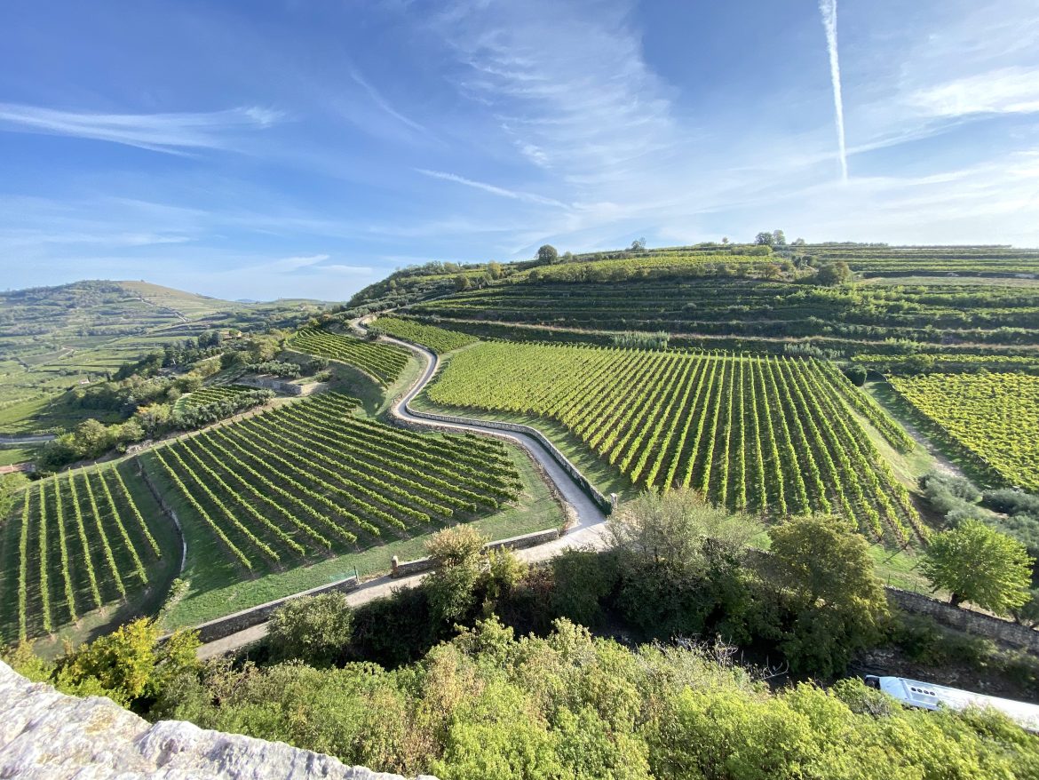 Den globala uppvärmningen har många negativa aspekter för de som drabbas av torka och extremhetta, men inom vinproduktion ger det mer arom och mineralitet i druvorna, då mer näring också hålls kvar i marken. Att plantera frukt och grönt på ”hård” mark ger tjocka skal för att frukterna vill skydda sig. Det växer exempelvis inte goda tomater här. Vind, sol och hård mark ger naturligt anpassade, härdade frukter. Druvan Garganega är ett utmärkt exempel på detta, en relativt liten druva till storleken men med en härlig arom, samt tjockt skal som kräver pergola att ge skugga, då för mycket stekande sol till slut får frukten att övermogna och spricka. I området fick vi även göra oss bekanta med Durella – liten, men i vinsammanhang relativt ny druva som Italienarna återupptäckte runt 1978 då man åkte på inspirationsresa till Champagne-området. Poppis att skapa bubbel av och växer i små buskar och på höjder, så beläggningar av skadlig svamp rinner av mini-rankorna. Durello kallas vinerna som ofta är syrliga, väldigt torra och friska. Ju högre tryck de produceras under, desto elegantare små bubblor på rad som lever i glaset. Durello är inte jättelätt att få tag i på systemet just nu, utan finns i små upplagor. Du som är nyfiken kan prova Muni.