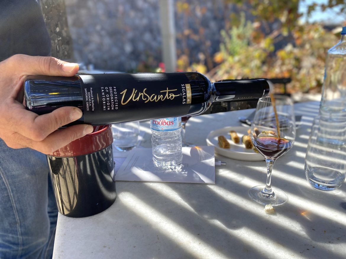 Öns lokala specialitet är annars Vinsanto, som står för Vin de Santorini (ej att förväxla med italienarnas Vin Santo) och är ett lagrat, sent skördat och torr-pressat efterrättsvin med mycket smak och relativt låg alkoholhalt (cirka 12%) samt en sockerhalt på 280-300 gr/l (ja, rena godiset). Tyvärr är produktionen liten och processen lång så du får söka runt om du ska få tag i en flaska, samt vara förberedd på att priset för en liten flaska börjar på ett par hundralappar och uppåt. Vinet ska lagras i minst 10 år och lagringsmöjligheterna sägs vara ”oändliga”, en av producenterna på Santo Wines hade 80 år gammal vinsanto som han beskrev smakade som ”espresso med torr frukt”. Från deras vingård, där du även kan handla och gå på provning, kan du njuta av solnedgången på Santorini på ett magiskt vis.