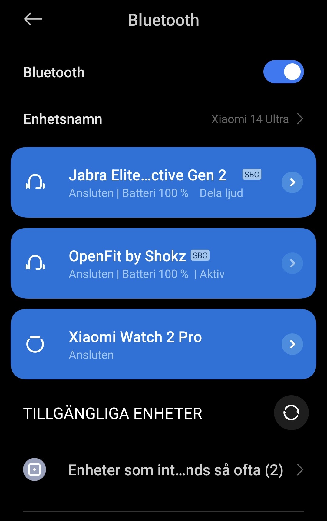 Något som dock imponerar är förmågan till dual-Bluetooth, alltså att du äntligen kan lyssna med två par hörlurar samtidigt när du sitter på tåget eller flyget. Apple kan detta också, men i deras fall kräver det Airpods eller Beats-lurar och vissa Samsung modeller klarar det också. Med Android 15 ska alla telefoner ges förmågan, men nu sällar sig alltså Xiaomi till en ganska liten och förnäm skara redan i Android 14. Vi testade funktionen mot Jabra Elite 8 Active – Gen 2 och Shokz Open Fit, det tog en sekund att få det att fungera och sedan flöt det på helt problemfritt, utan något som helst problem med synkning eller volym. Oerhört användbart och något som vi kan tycka borde ha kommit för ett tag sedan! När det gäller volymen märkte vi dock att volymstegen har allt för stora hopp i endera riktningen vilket är irriterande i vissa sammanhang som till exempel med nattningspodden.