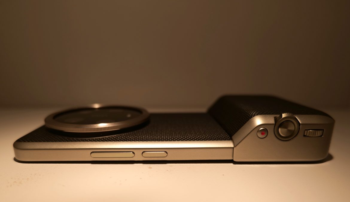 På kortsidan, där du i vanliga fall sätter in sladden, kan trycka på plats och låsa fast ett handtag som både fungerar som stöd för bättre handgrepp (med avtryckare precis där ska vara och halvstegstryck för skärpa innan fotot tas) och som en powerbank på 1500 mAh. Till det, en liten handsnara så att du inte tappar kalaset.