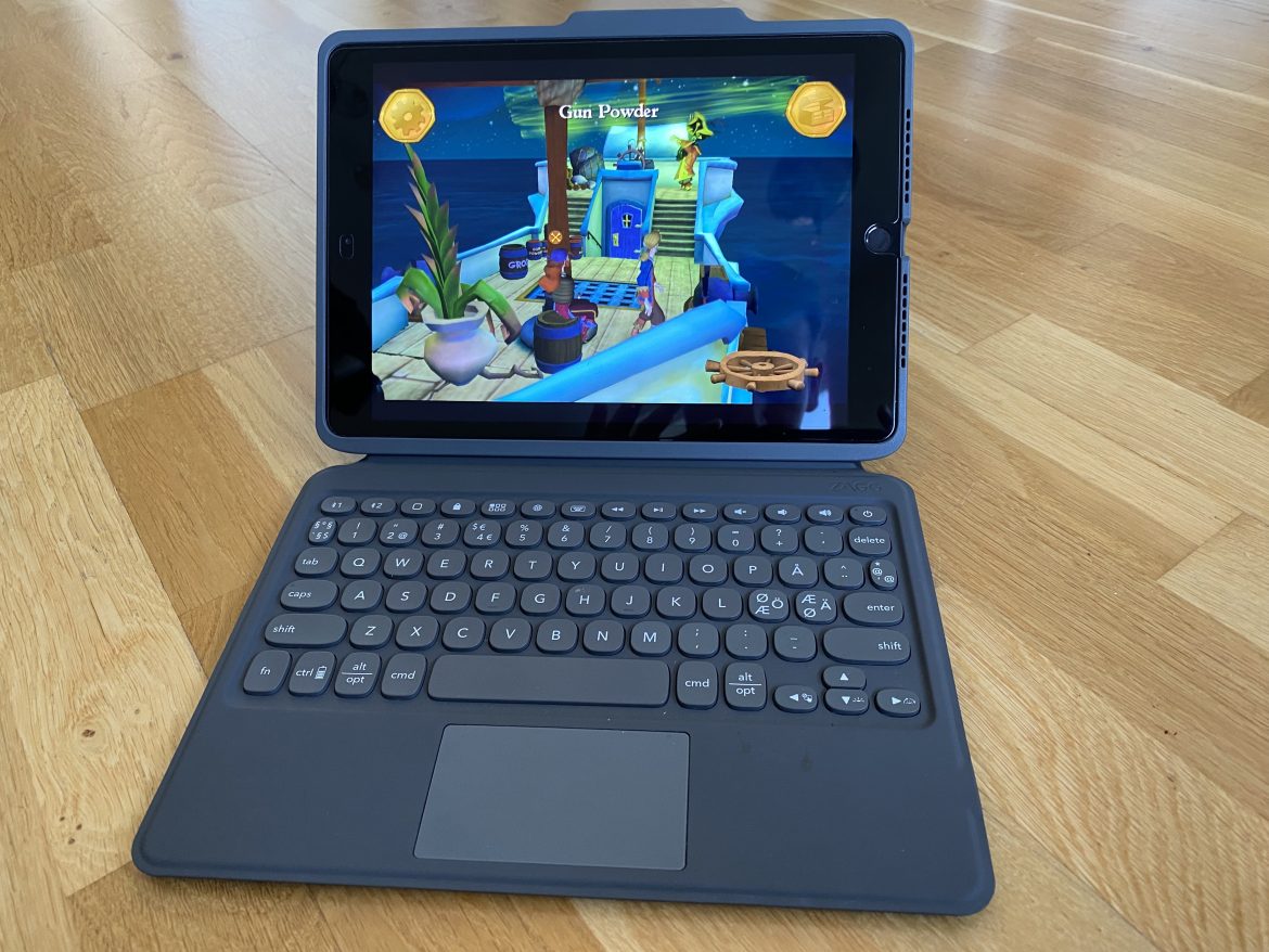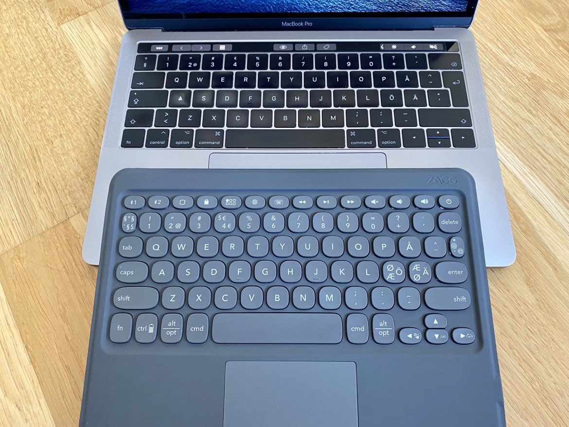 Zagg Pro Keys består av två delar – dels själva tangentbordet med magnetisk, vikbar del, dels gummiskyddet som omhuldar din iPad (finns till standard iPad 10.2″ och Pro-modellerna på 10.9/11″) och ska göra att den klarar fall från nästan två meters höjd (förutsatt att den inte landar med skärmen nedåt, får vi anta). Gummihållaren har även ett spår med plats för en Apple Pencil (eller tredjepartsmotsvarighet som ZAGGs egen Pro Stylus). Själva designen är inte så unik som man först kan tro; alla iPad-skal med vikbar del ser i princip likadana ut, men på ZAGGs hemsida kan man få inrycket att man genom detta kan bestämma lutningen och höjden av iPad:en att bli mer som en datorskärm. Men om detta faktiskt går att göra så kom vi inte på hur (och det står inget i manualen om det heller). Här verkar det vara vika in och få runt 45 graders lutning som gäller och det funkar helt OK för ändamålet. Tangenterna är sköna och svarar bra, du kan aktivera bakgrundsbelysning (som drar extra batteri) och pekaren fungerar precis som den ska (dyker upp som en liten, grå cirkel), vilket exempelvis är bra för peka-och-klicka-äventyr såsom Tales of Monkey Island (beroende på arbetsuppgifter så kan dock touch-funktionen direkt på skärmen vara snabbare). I vanlig ordning är tangentbordet något mindre än ett ”vanligt” tangentbord på en bärbar dator, men faktiskt inte mycket mindre (se bild nedan). En kul bonus är också att Pro Keys kan kopplas till två enheter samtidigt via bluetooth och du kan sen växla mellan input till dessa. Så här har du i princip ett kompakt och fullt fungerande, extra tangentbord med inbyggd mus till datorn (både stationära och bärbara, om det skulle behövas).